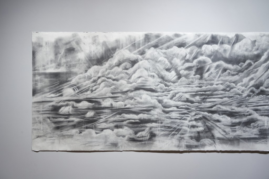 My work is produced through processing the ceaseless undercurrents of grief into visual forms that mimic clouds and ash. The forms emerge while I apply additive and subtractive mark making drawing techniques to paper. My drawings are linked to my imagination and are anchored in my research of the supernatural. Drawing is a crucial part of my grieving process. It serves as a safe place for me to mourn. The marks bring to substance an ambiguous space. The drawing acts as a mental and visual record, perhaps fragments of paranormal worlds.